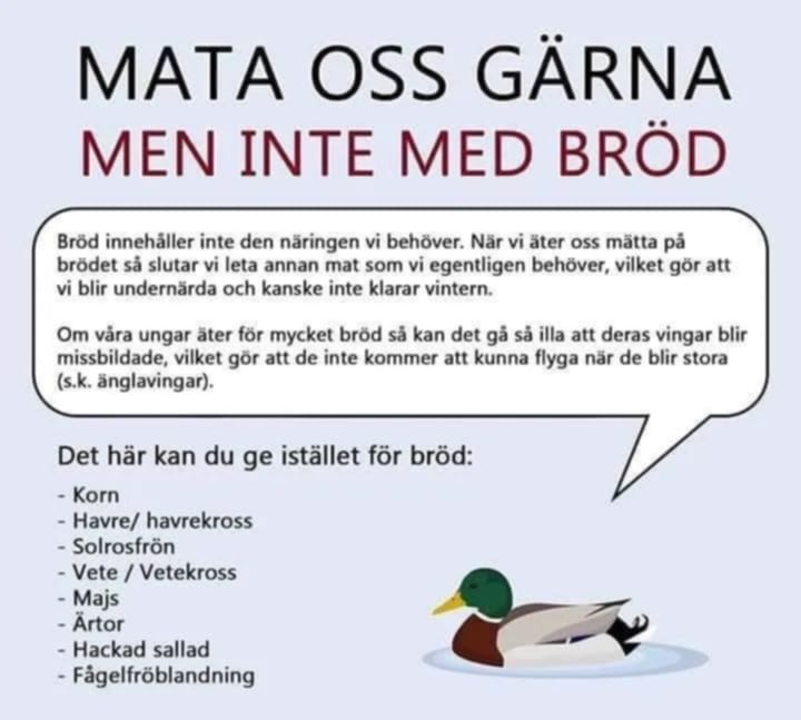 Många matar gräsänder med bröd och vet inte att det är skadligt för dem. Därför är mitt förslag att sätta upp skyltar vid ställen där många matar änderna om vad de kan ge dem istället.